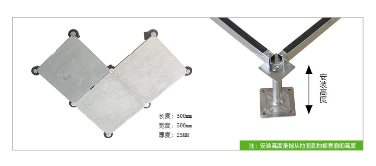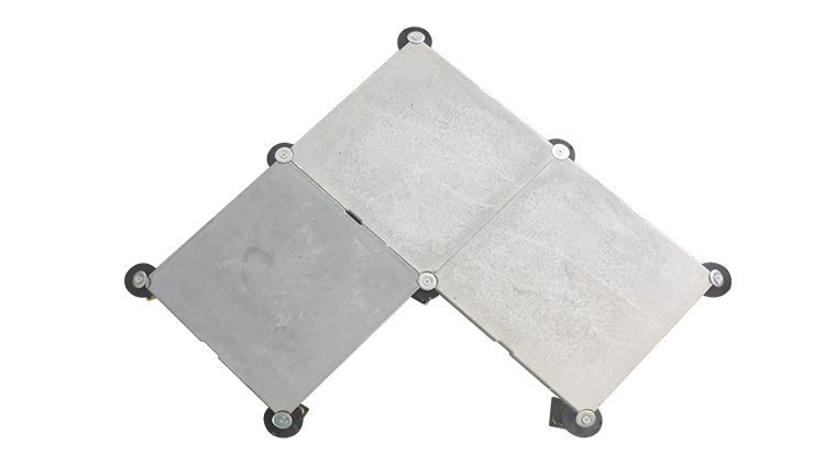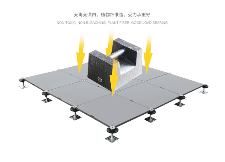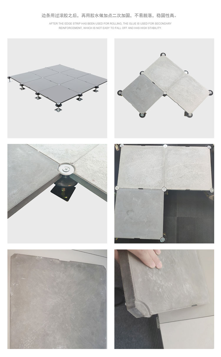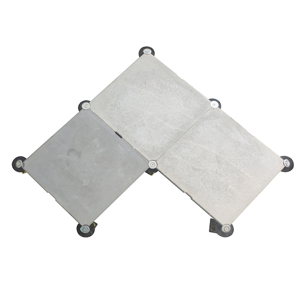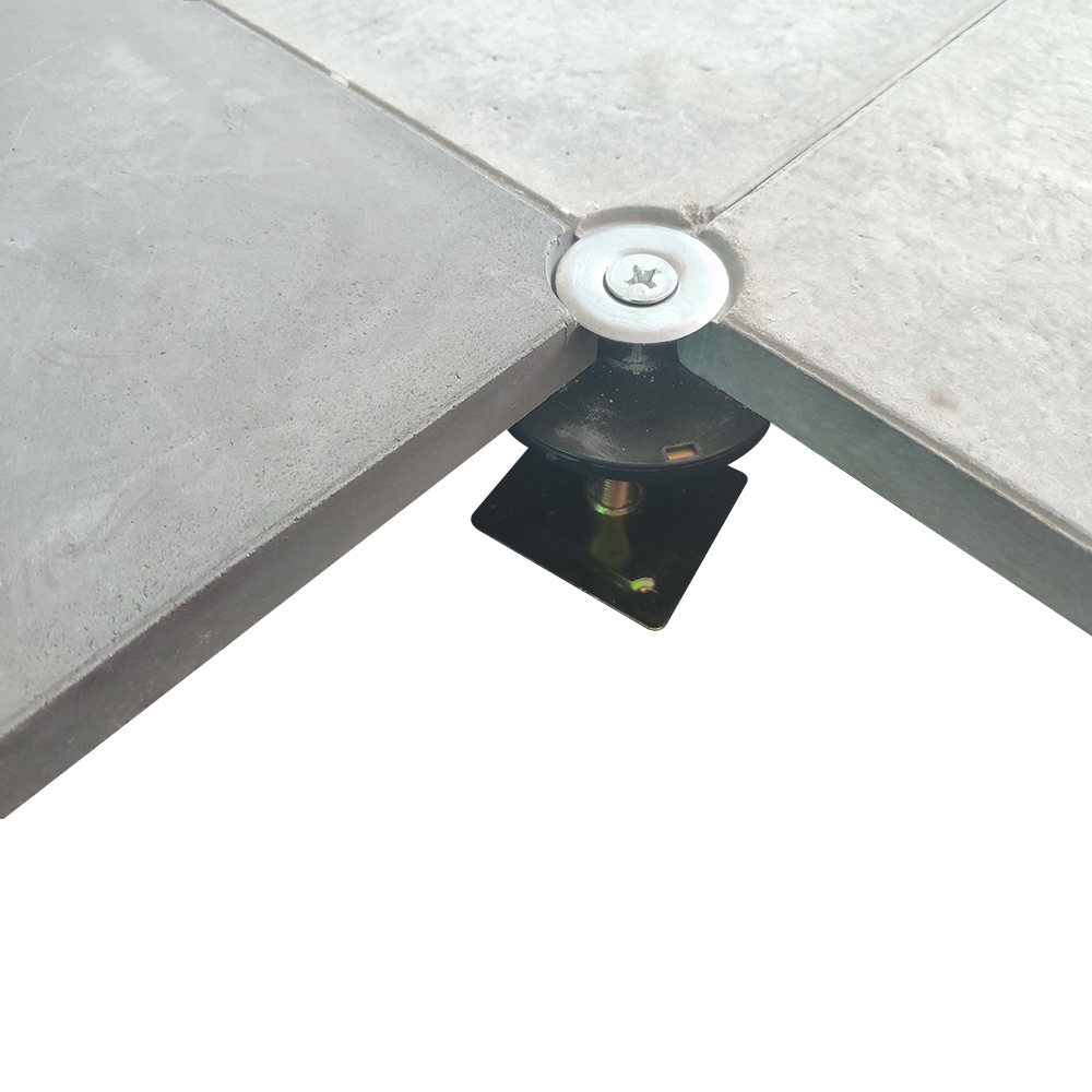 GRC水泥地板是由硅酸鹽、無機纖維、礦物纖維、石英砂等材料經(jīng)過高壓一次成型的環(huán)保地板,每塊地板自帶穿線孔。地板四角鍍鋅底座支承,不帶橫梁系統(tǒng)。每塊地板四角有90度圓弧,四塊板組合而成后形成一個圓,有一個鐵制螺母壓角固定。鋁頭上配有圓形緩沖定位橡膠墊,防止地板受力后顫動引起的響聲。支架高度可調(diào)5cm。